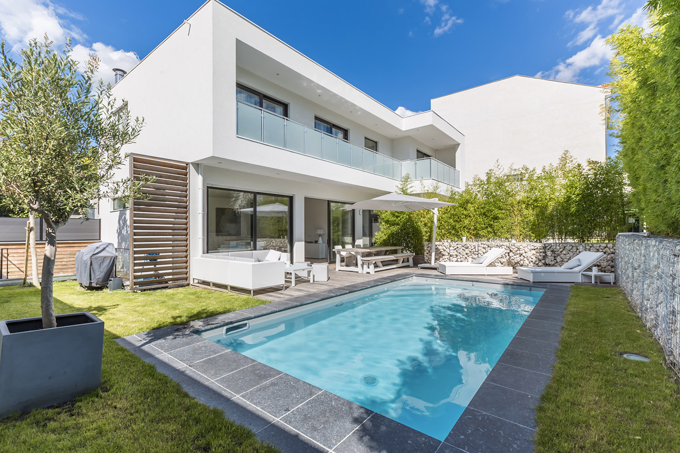 Le désir des propriétaires était d’orienter toute la vie de cette maison vers le jardin et sa piscine et de donner à cette habitation une connexion avec l’extérieur et un accès direct sur la terrasse.