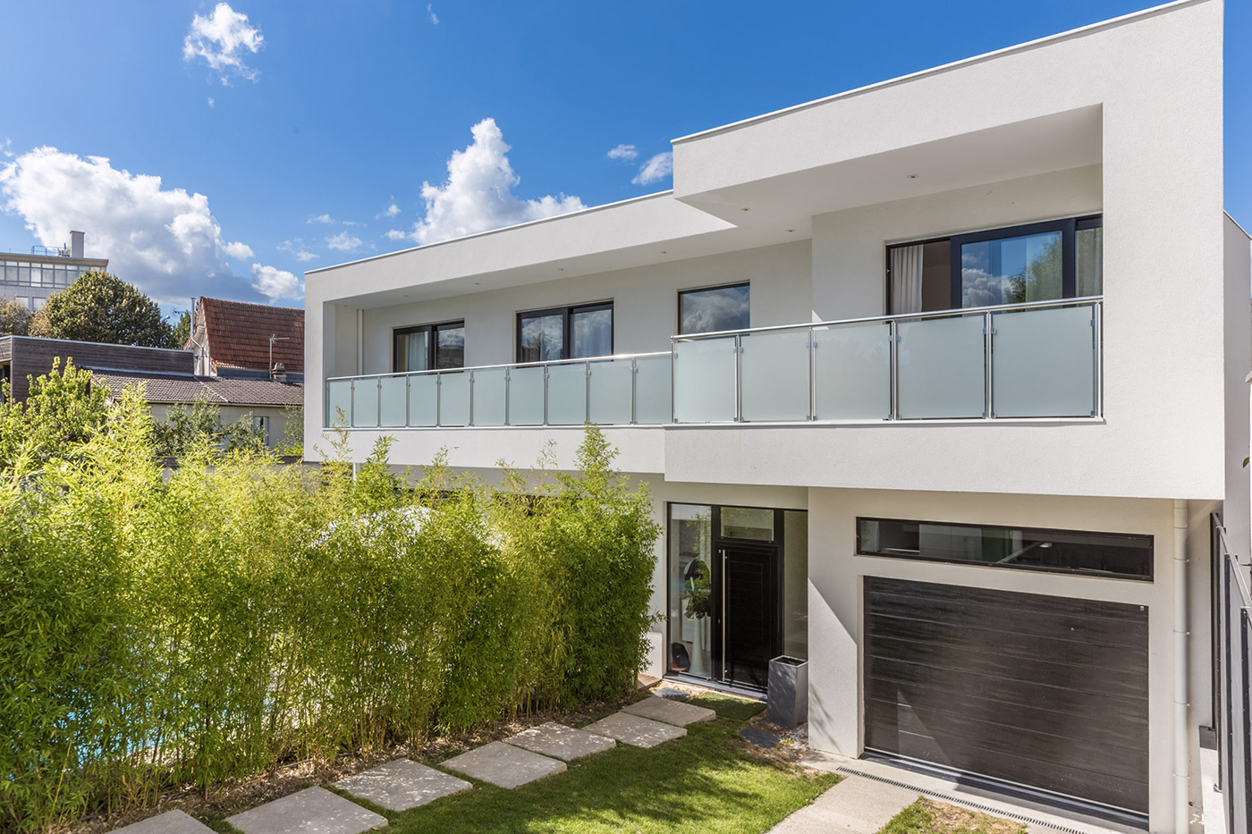 Cette maison à l’architecture moderne, épurée et au design minimaliste est en ossature bois avec une façade extérieure blanche.