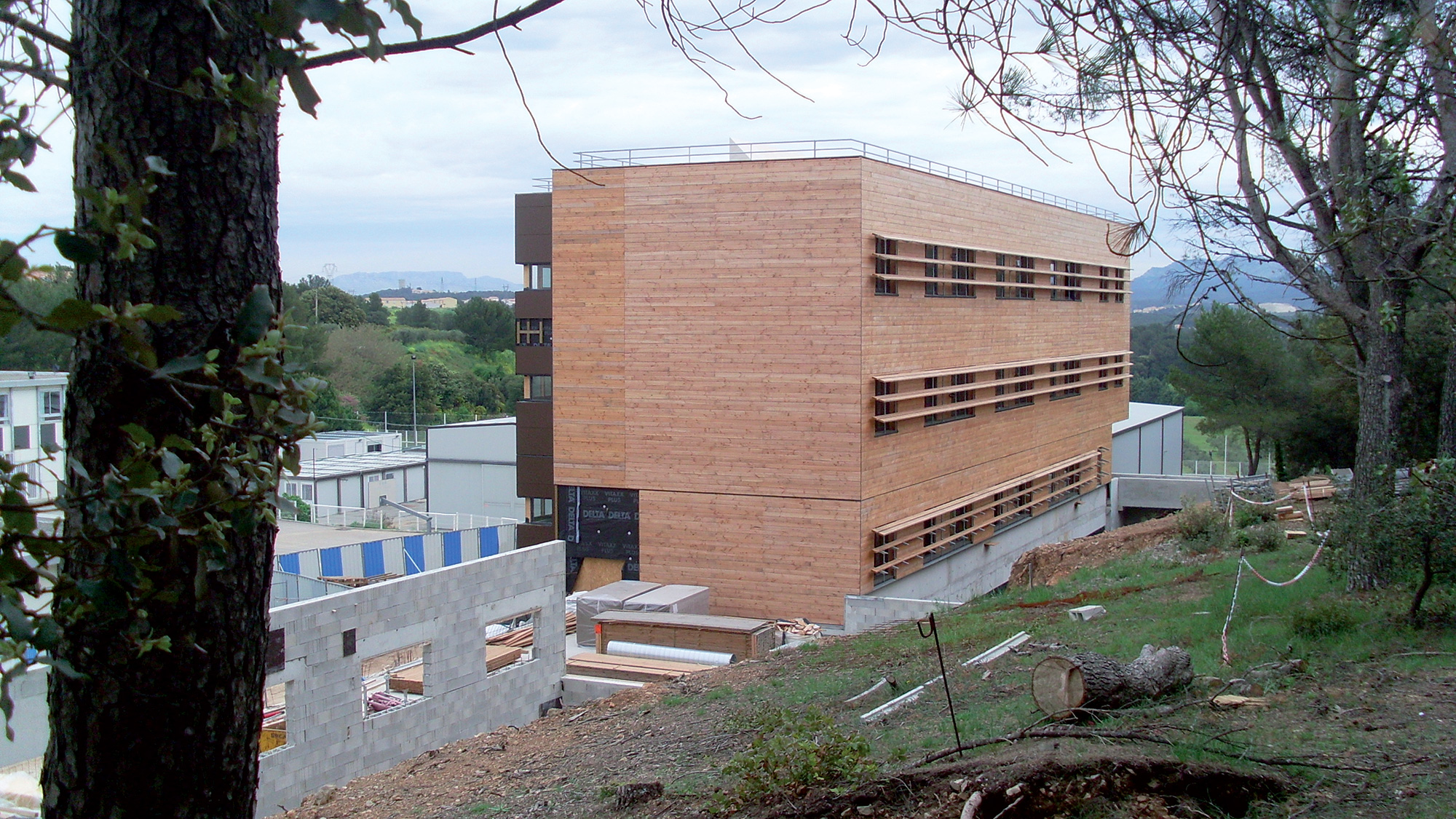 Ce projet est l’illustration d’une démarche environnementale qui met en avant la filière bois comme moyen de résoudre simultanément des problèmes de rapidité d’exécution, de flexibilité d’usage, de performance énergétique (bâtiments BBC), de confort, et de contribuer à réduire l’empreinte écologique de l’ensemble. Ainsi, les superstructures utilisent exclusivement le bois avec différents remplissages de façade. Le principe de construction retenu est majoritairement un système poteau-poutre basé sur une trame de 5,40m x 5,40m. L’usage massif de ce matériau (le seul dont la production absorbe du CO2) assure un bilan en énergie grise optimal, ainsi qu’une rapidité d’exécution grâce à la préfabrication, limitant ainsi les nuisances dans le temps et pendant le chantier (celui-ci étant mené en site occupé).